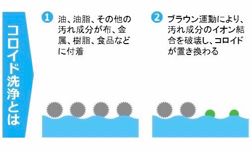 コロイド洗浄は、石油由来の界面活性剤ではなく 超微粒子のコロイドの力で汚れを洗浄をする方法です。1. 油、油脂、その他汚れ成分が布・金属・樹脂・食品などに付着する。 2. ブラウン運動により、汚れ成分のイオン結合を破壊し、コロイドが置き換わる。3. 汚れ成分のイオン結合を破壊し、再度付着しないように表面をコーティングする。4. 1/100,000~1/1,000,000に分解して微生物が食べやすくする。